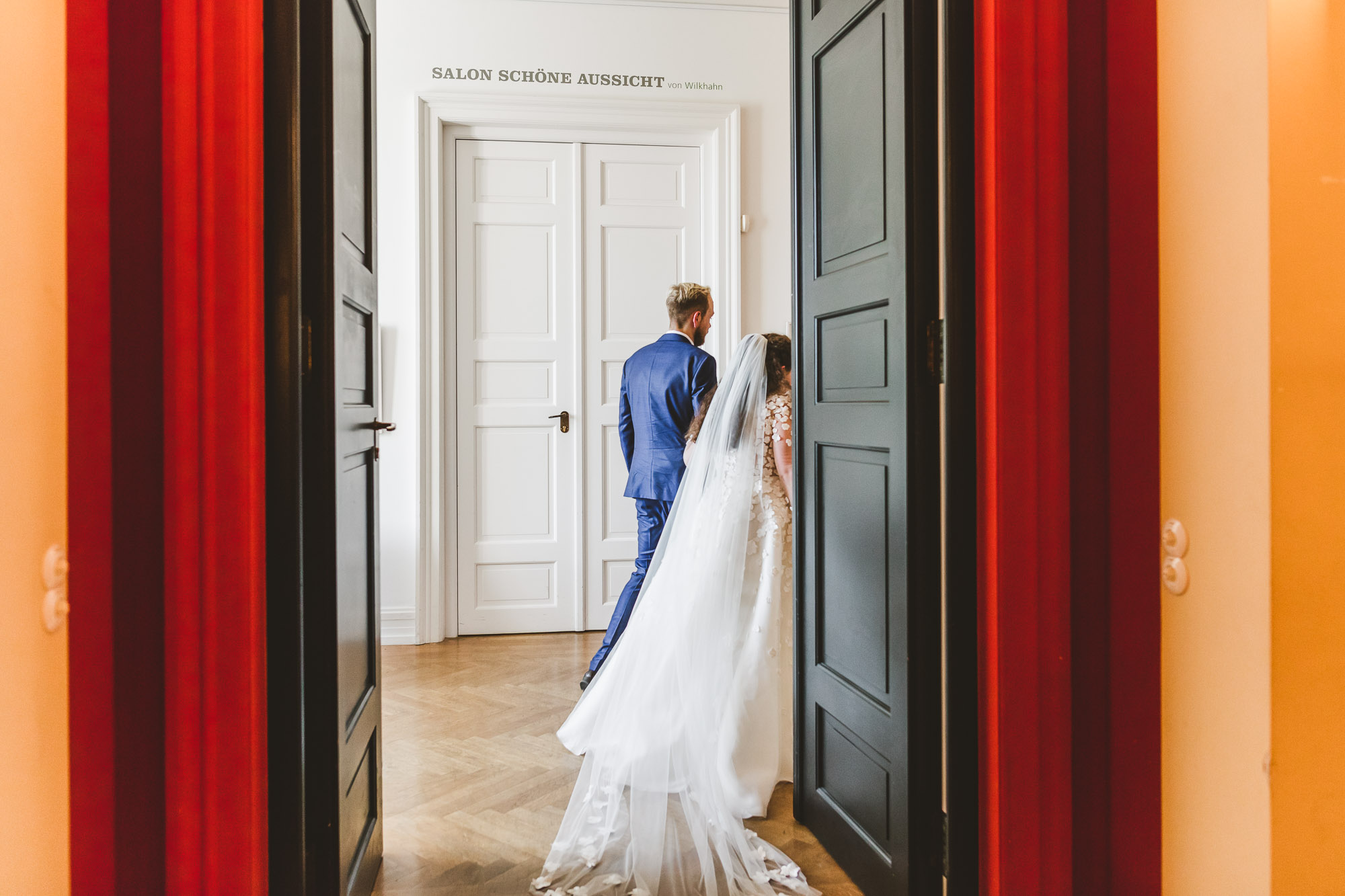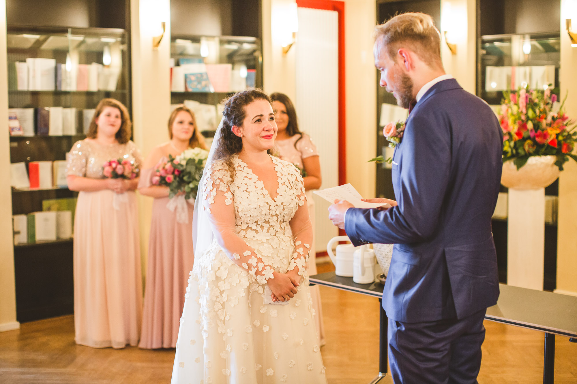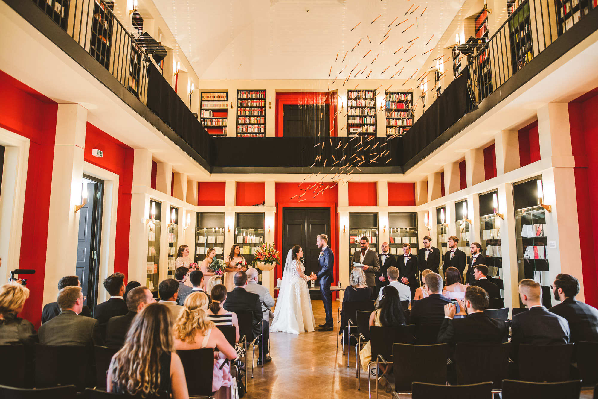 Gestartet haben wir den Tag mit dem Getting Ready welches im Fleming’s Hotel gleich nebenan stattgefunden hat. Nach dem First Look konnten wir bereits einige Brautpaar-Fotos im angrenzenden Park machen. Anschließend gab es einen kleinen Empfang für die Gäste, bevor es für die Freie Trauung in den Saal ins Literaturhaus ging.. Ein wunderschöner Saal der mit tollen Farben beeindruckt.