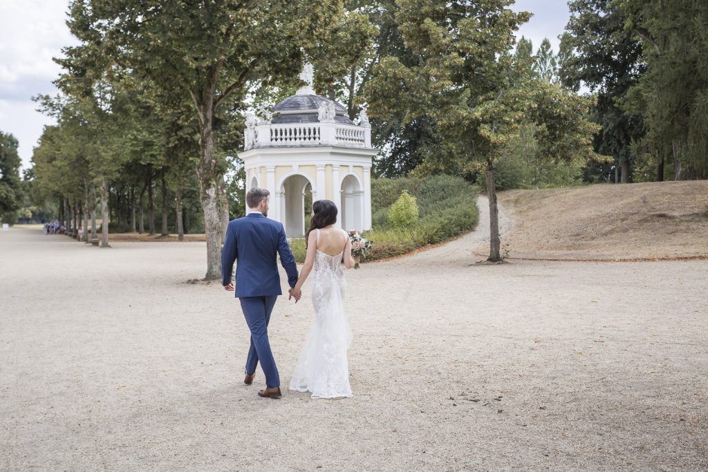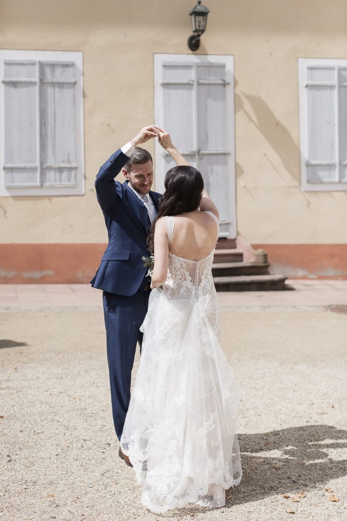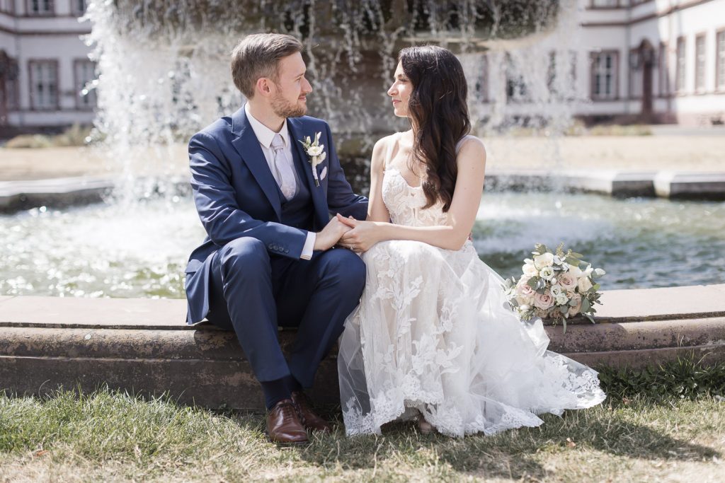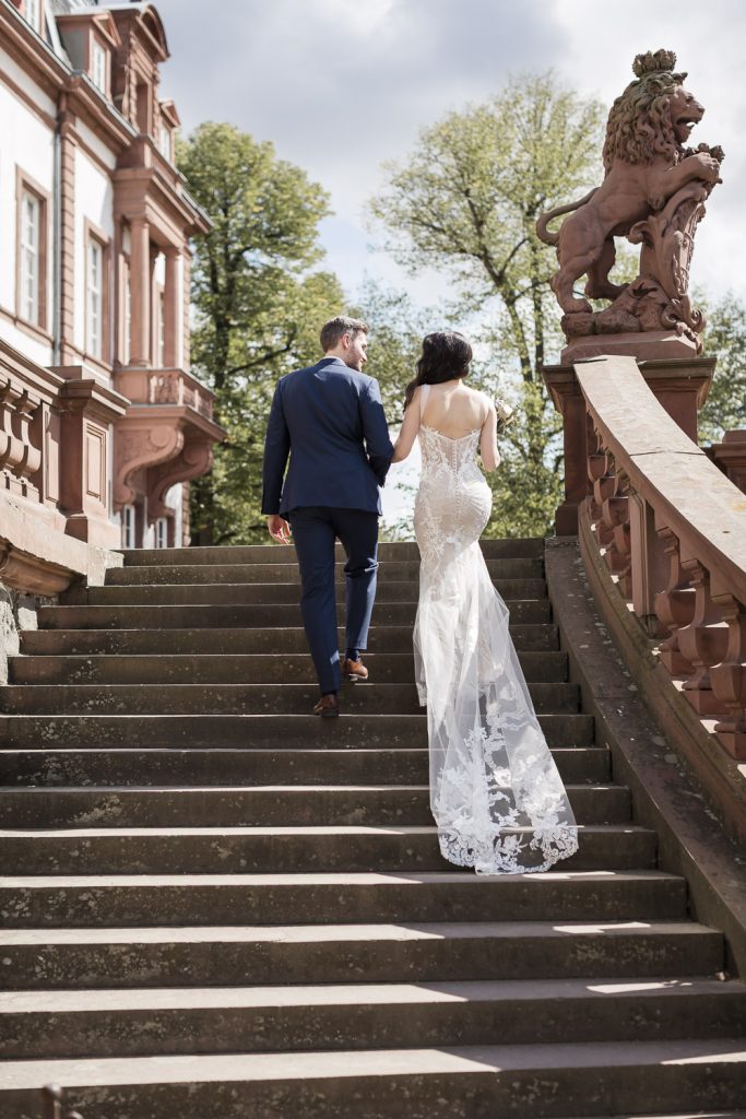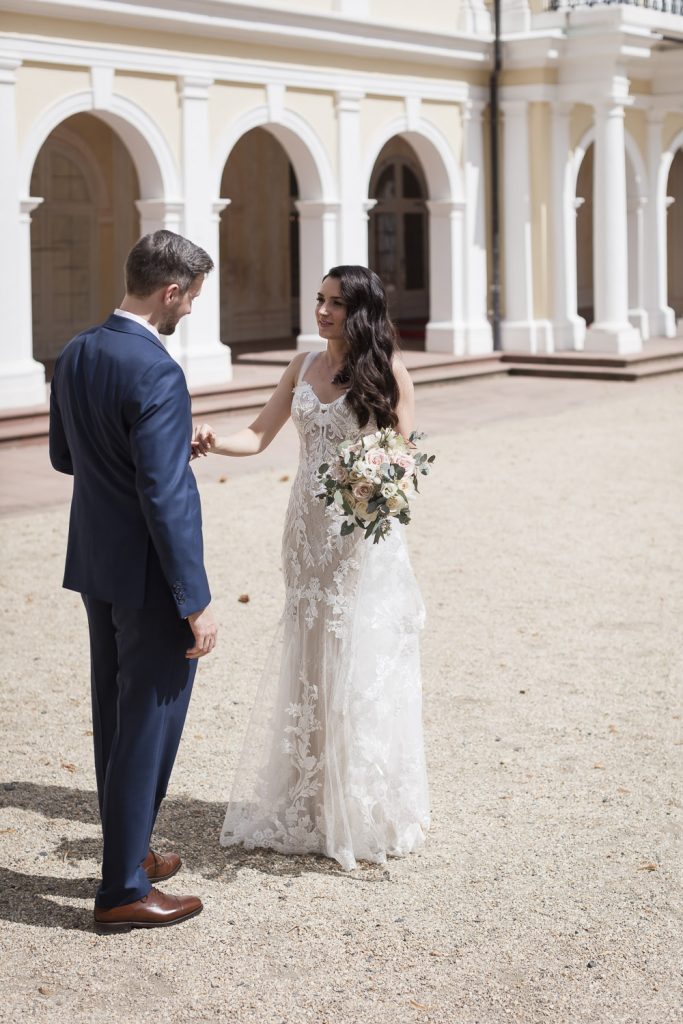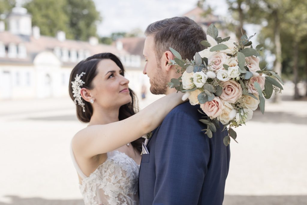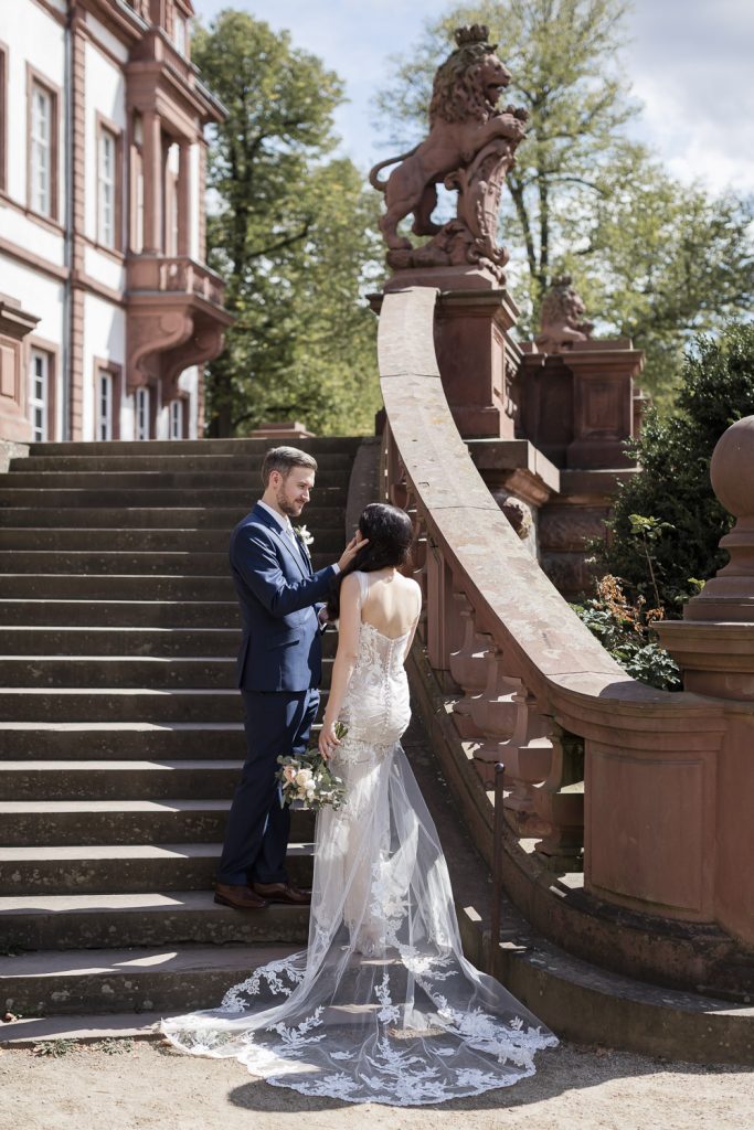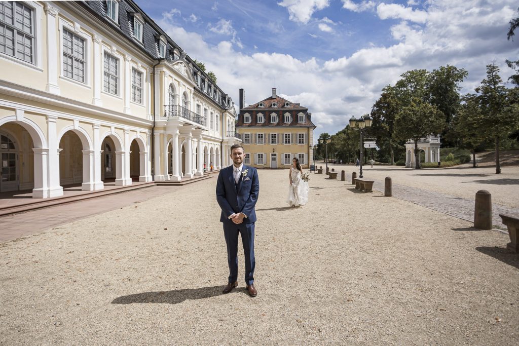 Der Tag begann mit dem First Look in privater Zweisamkeiten im idyllischen Schlossgarten. Hier konnten sich das Brautpaar in entspannter Atmosphäre das erste mal sehen. Die grüne Oase vor dem historischen Schloss bot eine traumhafte Kulisse für erste Fotos – liebevolle Blicke und die Vorfreude auf den großen Moment waren hier schon deutlich spürbar.