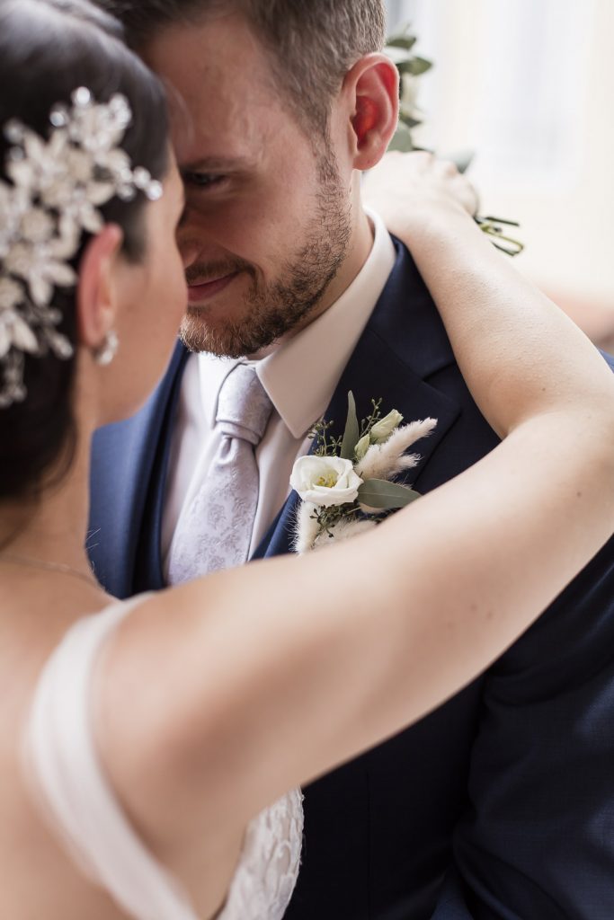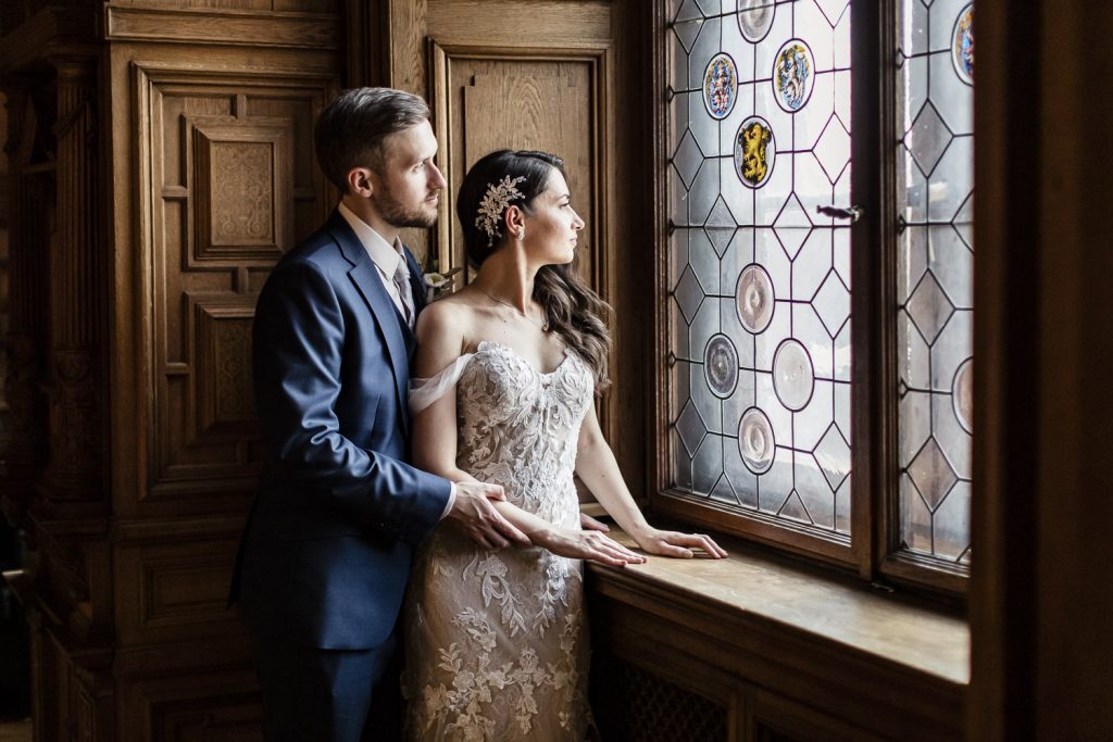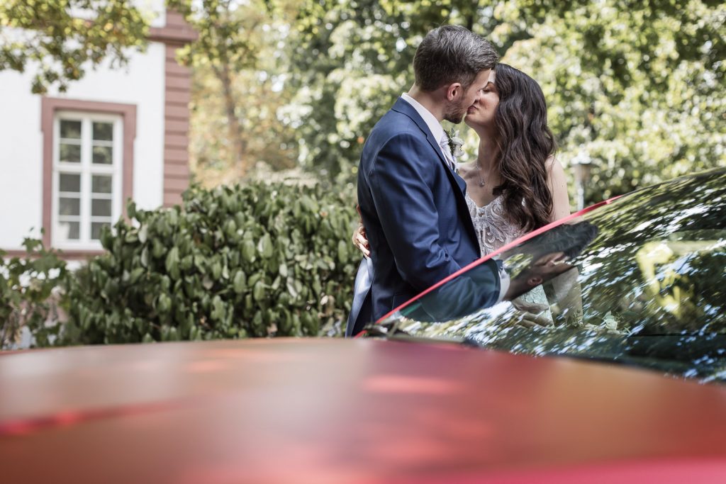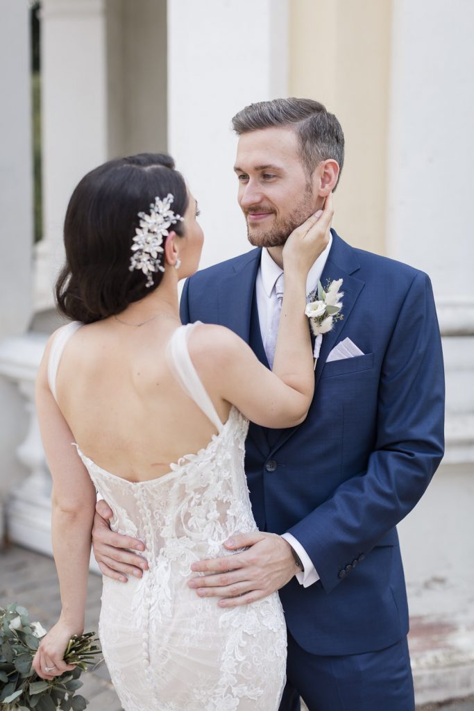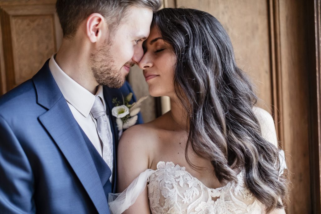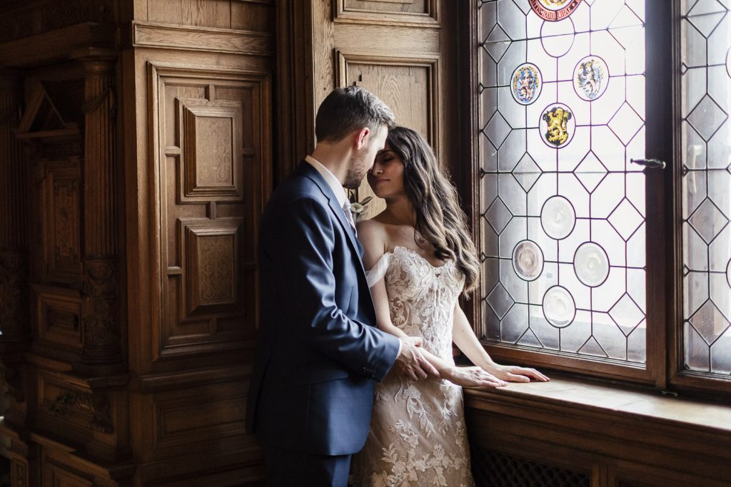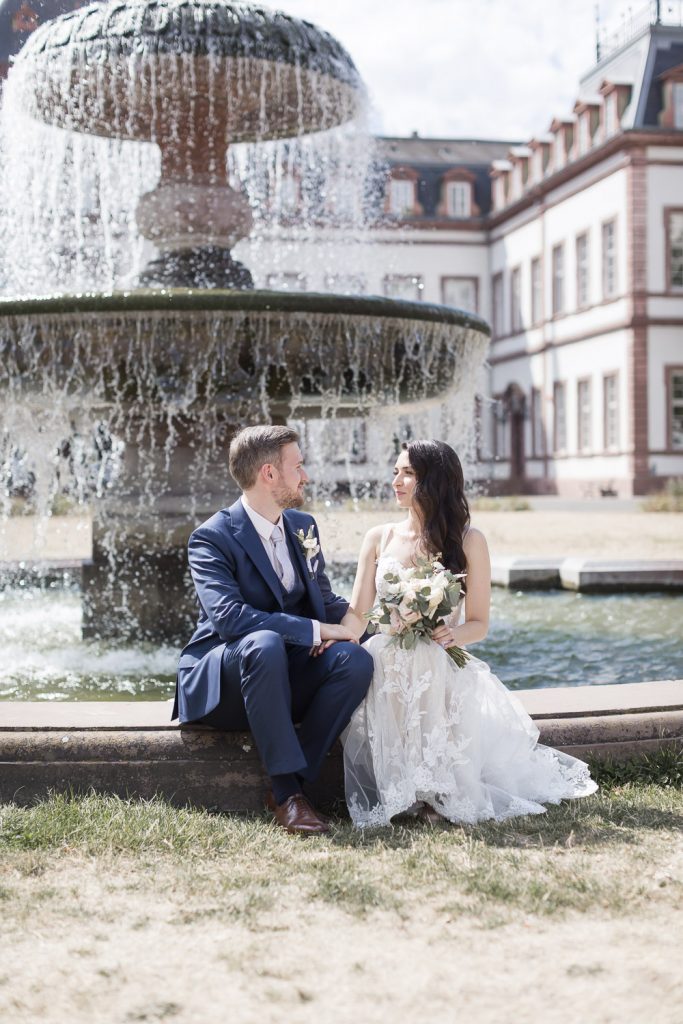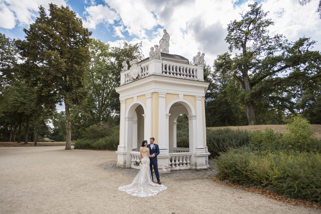 Der Tag begann mit dem First Look in privater Zweisamkeiten im idyllischen Schlossgarten. Hier konnten sich das Brautpaar in entspannter Atmosphäre das erste mal sehen. Die grüne Oase vor dem historischen Schloss bot eine traumhafte Kulisse für erste Fotos – liebevolle Blicke und die Vorfreude auf den großen Moment waren hier schon deutlich spürbar.